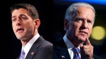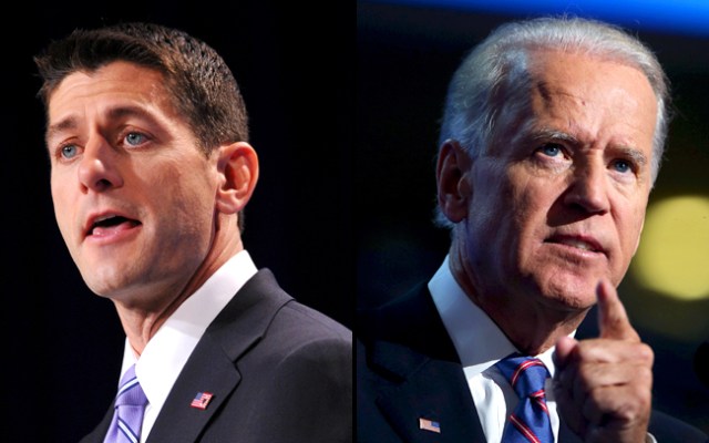 (Left) Republican vice presidential candidate Paul Ryan speaks at The Family Research Council (FRC) Action Values Voter Summit on September 14, 2012 at a hotel in Washington, DC. (Right) Democratic vice presidential candidate, U.S. Vice President Joe Biden speaks on stage during the final day of the Democratic National Convention at Time Warner Cable Arena on September 6, 2012 in Charlotte, North Carolina