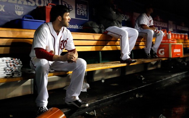 Bryce Harper looks on from the the dugout after the Nationals loss to the Cardinals in Game 5 Friday. (Photo by Rob Carr/Getty Images)